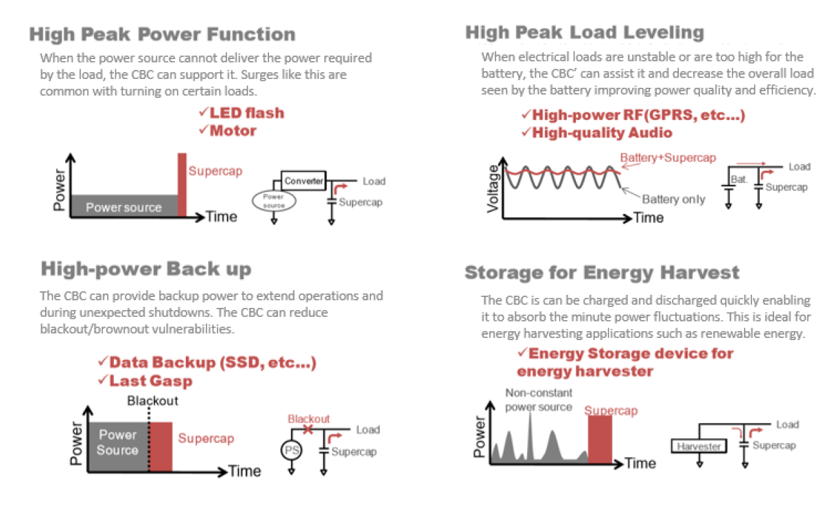 Reality: The mechanism of storing electrical energy in supercapacitors through ions does not have anywhere near the energy density of batteries. In fact, as it stands, batteries can store anywhere from 10 to 100 times the amount of energy density that supercapacitors are able. However, this misses the point of using supercapacitors and CBC’s for their original and intended purpose. CBC’s can accept and deliver their electrical energy much faster and more efficiently than batteries can due to their large power density. Ideal uses of CBC’s are summarized in this illustration.